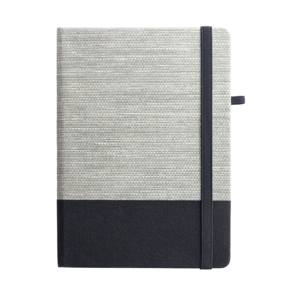 A5 notepad with hardcover and rounded corners made from natural straw and cotton canvas. This notepad has 192 lined white pages (70 g/m²), bookmark ribbon, elastic band and pen holder (pen not included)