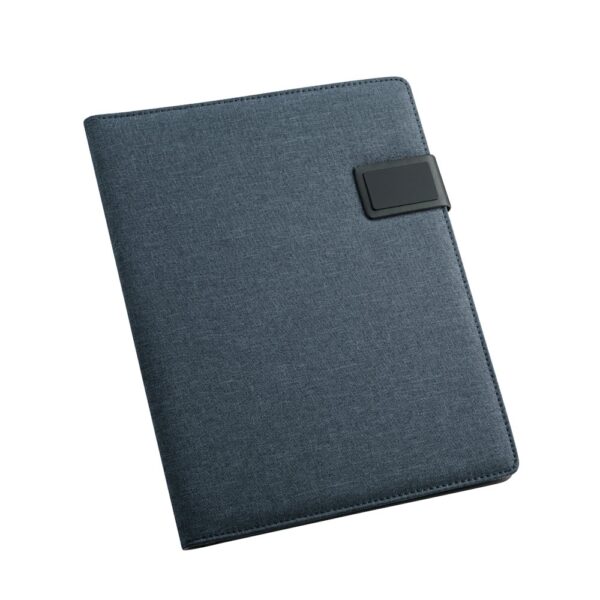 A4 imitation linen and PU folder . Features a magnetic closure with a customisable plate, a 40 lined pages pad with lined paper (60 g/m²), pen holder (pen not included), smartphone pocket and brackets for cables or other accessories (not…