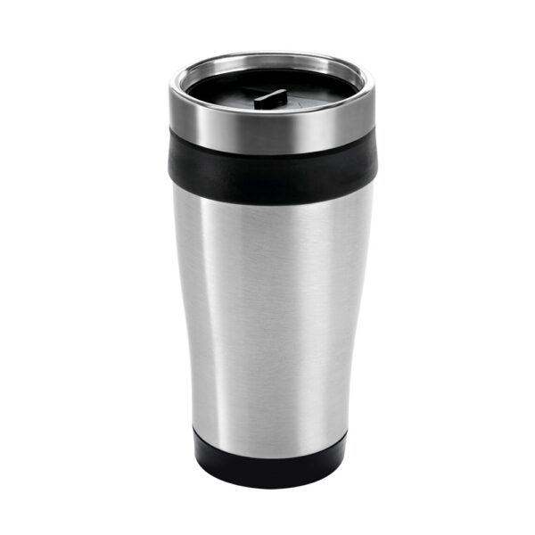 Double-walled, air-insulated PP travel cup. The lid features a sliding system for easy use. The travel cup is dishwasher and microwave safe, requiring the lid to be removed. Capacity up to 420 mL