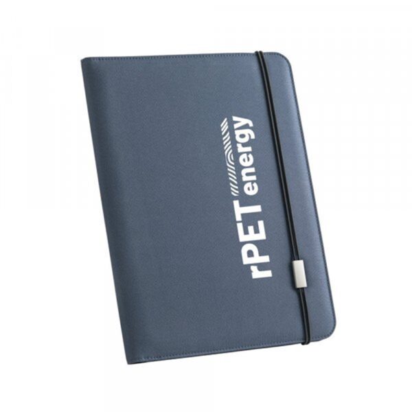 300D recycled polyester (100% rPET) A4 folder with elastic closure. Interior with multiple pockets, pen holder (pen not included) and a notepad with 40 white lined pages. Supplied in a non-woven pouch