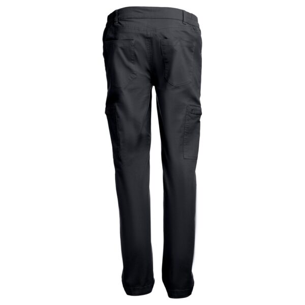 98% cotton and 2% elastane trousers (240 g/m²). Contains 6 pockets: 2 side pockets with zip closure, 2 front pockets and 2 back pockets. Waist with elastic on the sides