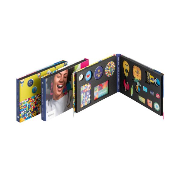 2 in 1 Pins and Doming showcase in plasticized card with magnetic closure. The interior is divided in 2 parts that contains the different models of pins (circular and rectangular)…