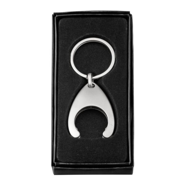 Coin-shaped key ring. Supplied in gift box