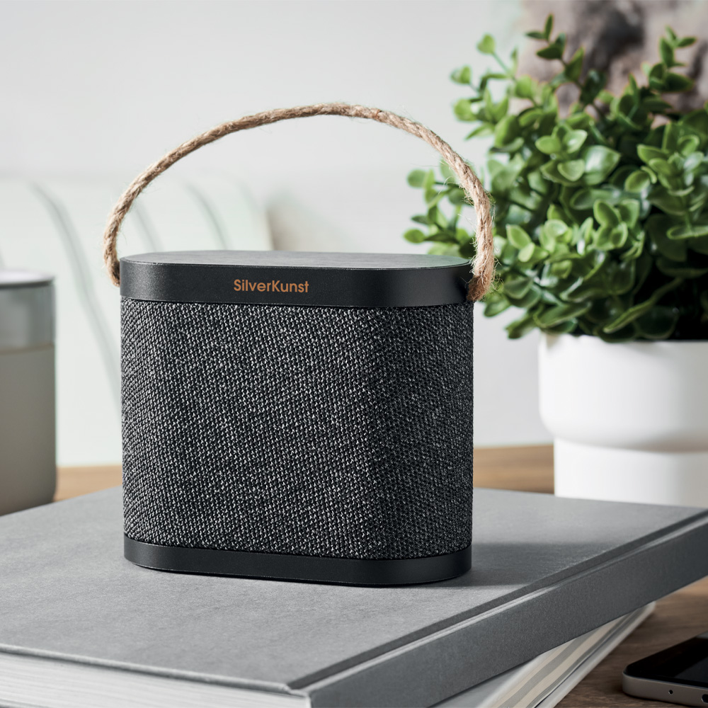 5.3 wireless speaker in ABS with RPET polyester fabric finish and bamboo 15W wireless charger top, with jute handle. 1 Rechargeable Li-Ion 1200 mAh battery. Output data: 5W, 4 Ohm and 5V. Playing time approx. 4h. 12X6X10 CM
