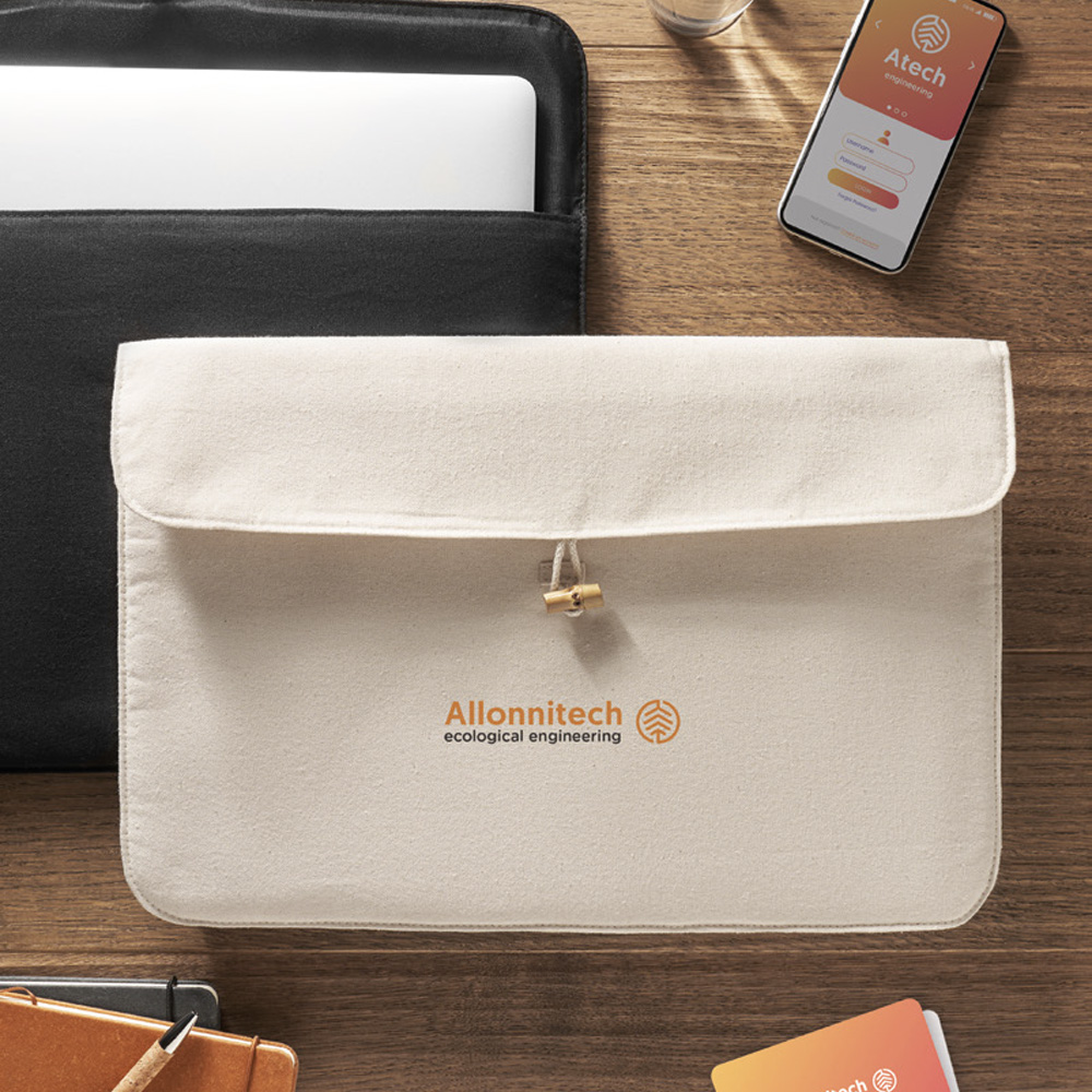 15 inch padded laptop pouch in 220 gr/m² cotton. Inner lining 120 gr/m². Bamboo button closure. 39.5X27CM