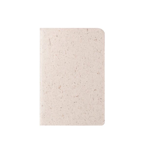 A5 notepad with hardcover and rounded corners made from natural straw and cotton canvas. This notepad has 192 lined white pages (70 g/m²), bookmark ribbon, elastic band and pen holder (pen not included)