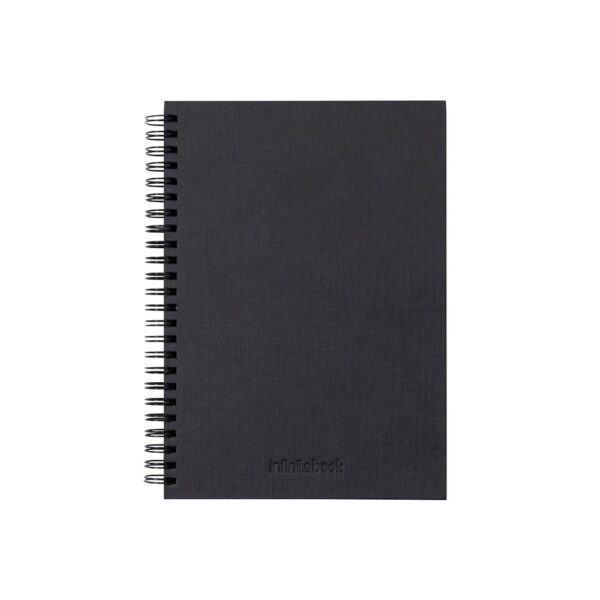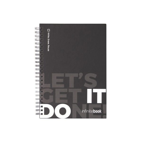The “Infinitebook” A5 starter kit allows you to easily erase everything you write down and start over as often as you like. It consists of an Infinitebook with a hard cover and rings, a cleaning kit (empty spray bottle, sponge…