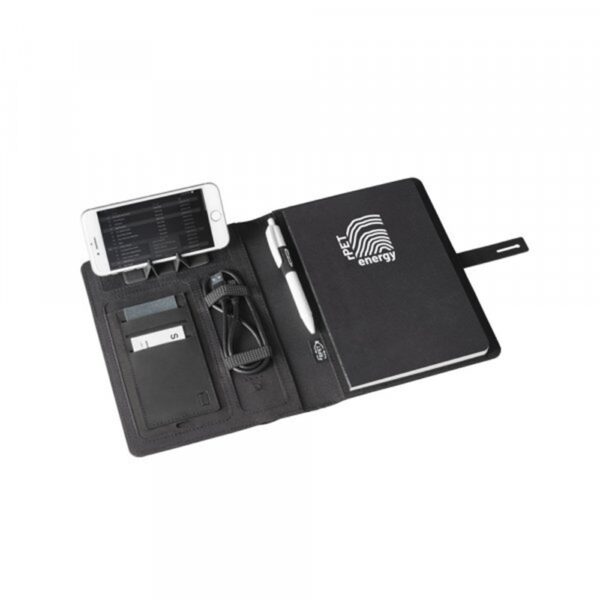 300D recycled polyester (100% rPET) A5 folder with built-in wireless charger. The battery has a capacity of 5.000 mAh, 5 W power, 5V input/output and a USB-C cable to charge it. The folder contains a smartphone pocket inside for a…