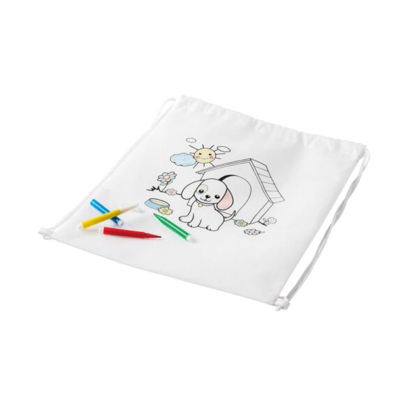 Non-woven drawstring bag (80 g/m²) with childrens drawing to colour. This product is supplied with 4 markers. Ideal set to offer to occupy kids