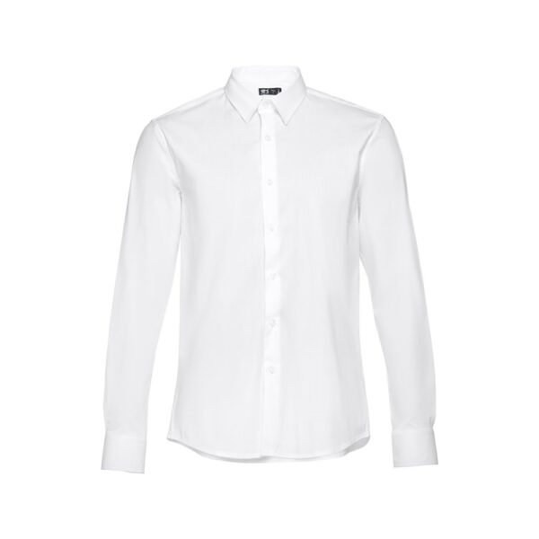 Long-sleeved men’s shirt in 68% cotton, 28% polyamide and 4% elastane (115 g/m²). Long sleeve with 1 pleat and adjustable cuffs with 2 buttons. Placket with 7 buttons in matching colour