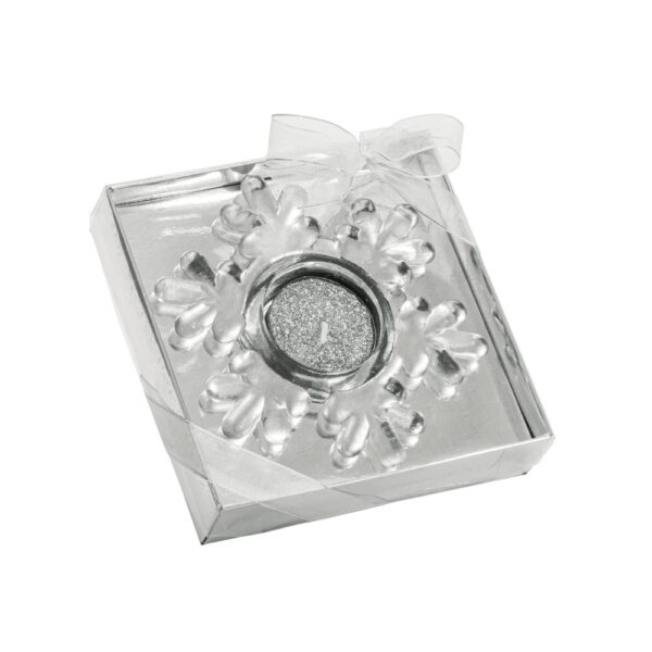 Candle in snowflake-shaped glass base. Gift box included