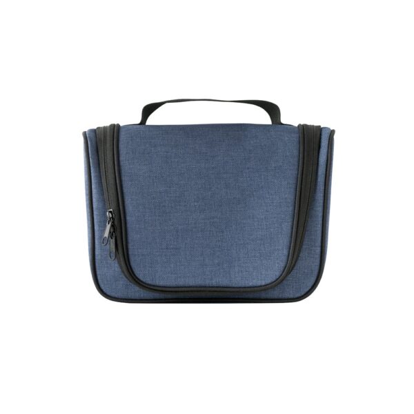 Toiletry bag in high density 600D. The main compartment has a two-way zipper and 210D lining. It contains several interior pockets and a convenient hanging hook on the top