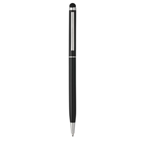 Recycled aluminum ballpoint pen (100% RAL) with a rubber finish. Its minimalist design combines matte metallic gray details and a bamboo button at the top. It features a clip and blue writing. When laser engraved, the personalization color will turn…