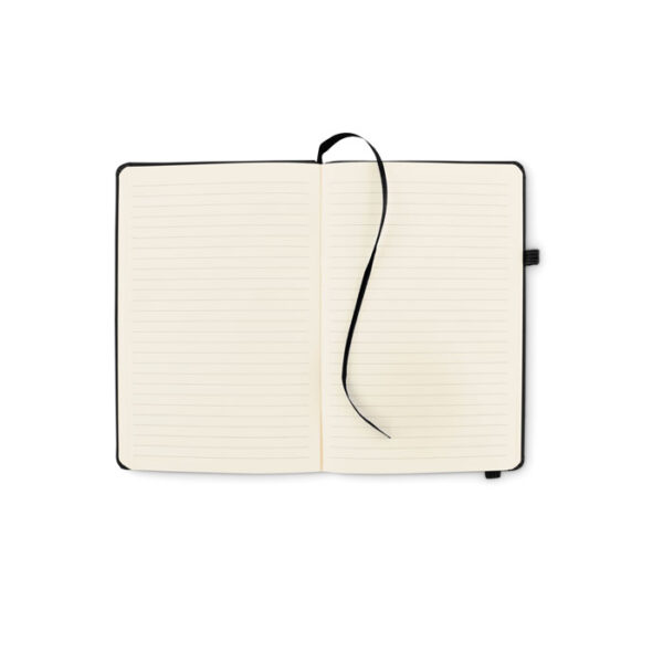 A5 notebook with 70% recycled pre-consumer leather and 30% latex PU cover. Casebound. 192 lined pages recycled paper (96 sheets). Matching cotton elastic closure strap and pen holder.