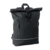 15 inch roll top laptop backpack in soft PU with padded back and base reinforcement with reflective strip. Waterproof zippered front pocket. 210D RPET polyester lining.