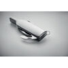 Stainless steel wine bottle shaped pocket knife with 6 functions: bottle opener, knife, corkscrew, foil cutter, magnifying glass and key ring.