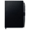 A6 notebook with pen. Hard PU cover. Casebound. 144 lined pages (72 sheets). Matching elastic closure strap, ribbon bookmark and pen holder. Matching metal push button ball pen. Blue ink. FSC MIX CREDIT | P7.1 | FSC-C213206