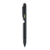 Twist action spirit level pen in stainless steel with ruler, stylus and Phillips head and flat head screw driver bits and LED. 3 AG batteries included. Blue ink.