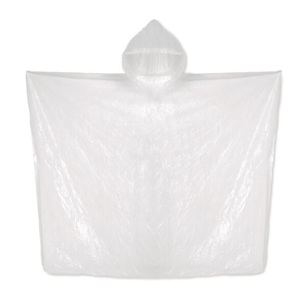 Foldable poncho with hood in biodegradable material and also packed biodegradable bag.
