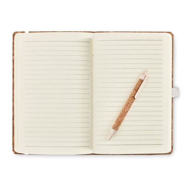 A5 cork notebook with matching pen. Hard cork cover. Casebound. 160 lined recycled paper pages (80 sheets). Elastic closure strap and pen holder. Matching push button ball pen with cork barrel and 50% wheat straw and 50% PP details. Presented in a gift box.